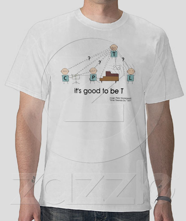That said, I'd like to point out one important aspect of this discussion often left out, to the detriment of our common understanding of what we do. In Westergaard's article, "What Theorists Do," brought up by Charles, there is a lovely diagram of the professional activities of musicians (included below in T-shirt form, created by a former grad school colleague and the only version of the diagram I have on hand—caption is not Westergaard's):